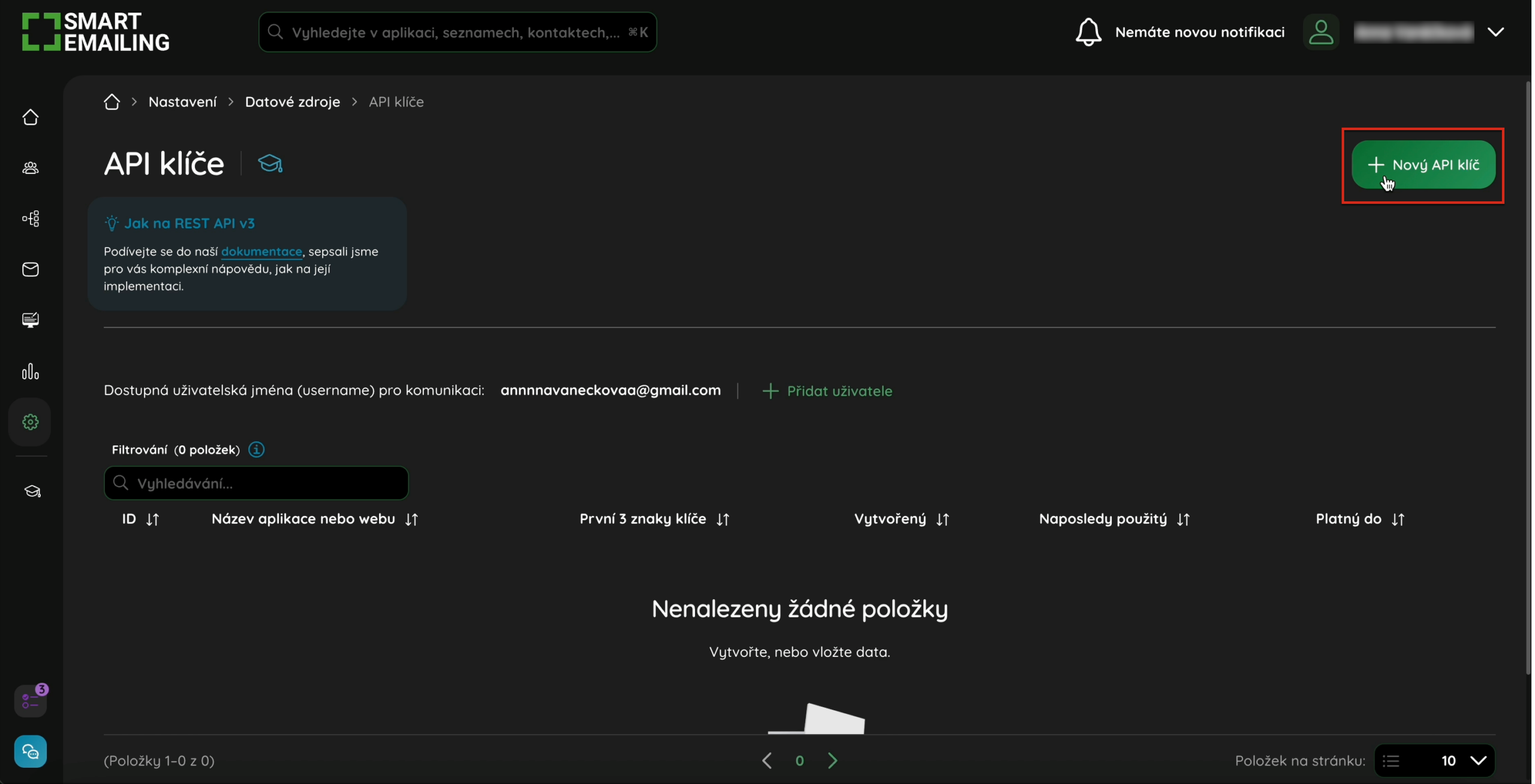 Na další stránce klikněte v pravé horní části na tlačítko +Nový API klíč.