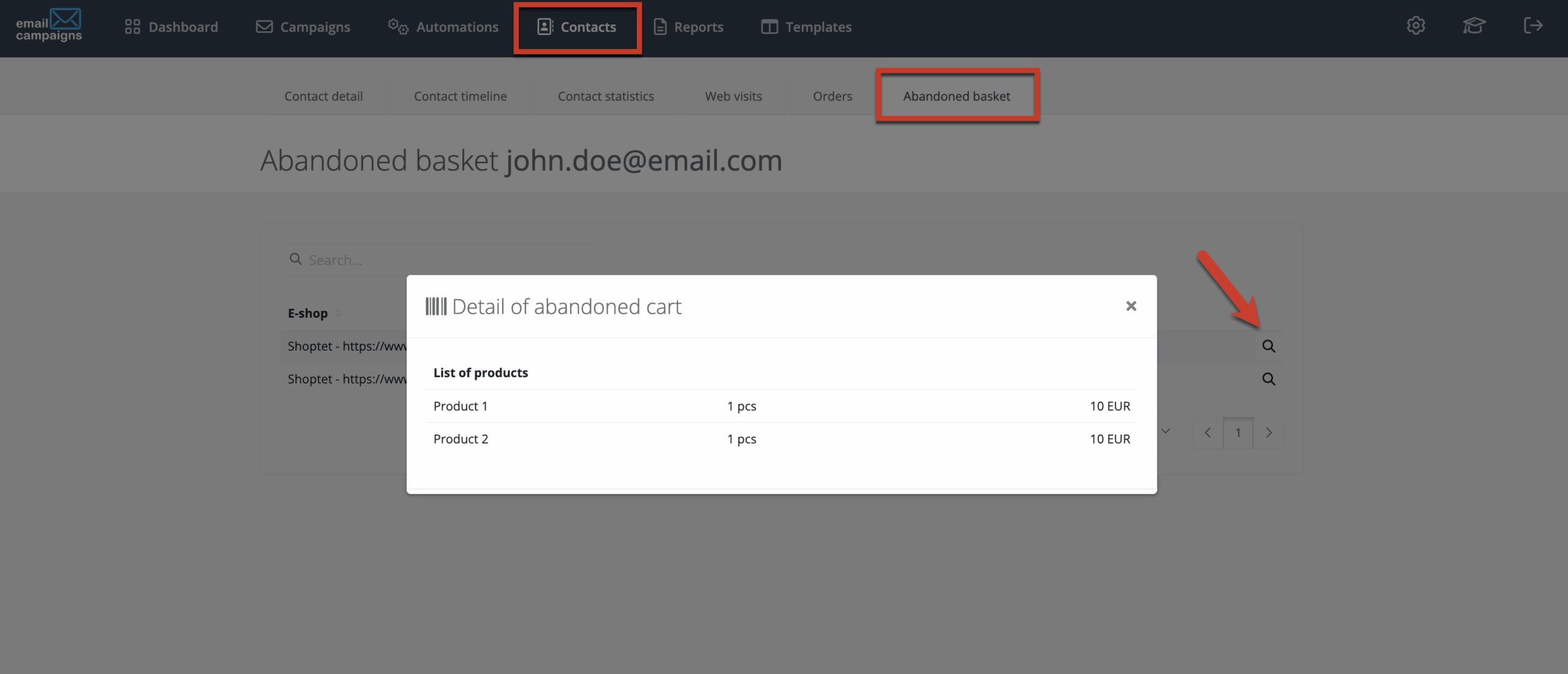 - After sending, you can track abandoned cart data directly in the client’s profile. You can see who left without completing their purchase and which products remained in the cart. Go to the Contacts section, select a customer and click on the Abandoned cart tab. By clicking the magnifying glass icon, you will see a detailed overview of the cart including product names, quantities and prices.